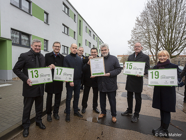 Zum ersten Mal überhaupt wurde ein großes Mehrfamilienhaus in Sachsen-Anhalt durch die Landesenergieagentur Sachsen-Anhalt GmbH (LENA) mit der Grünen Hausnummer Plus ausgezeichnet. Unser Unternehmen und unser Wohnhaus, die Adolf-Kolping-Straße 13 – 19, wurden damit für die energieeffiziente und nachhaltige Sanierung gewürdigt.